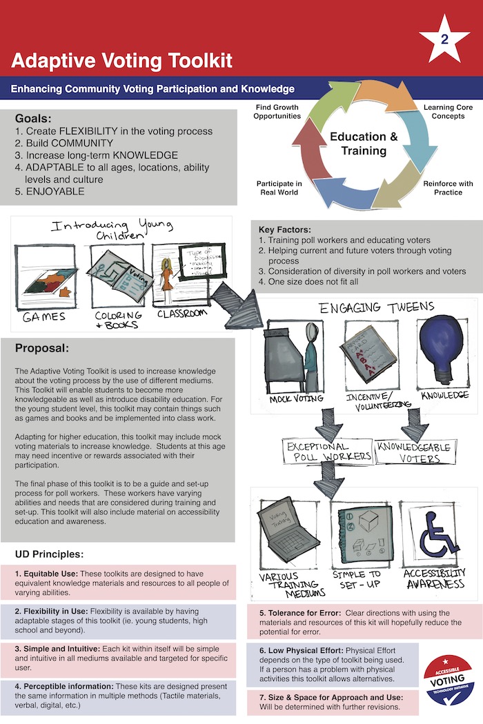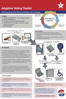 The Adaptive Voting Toolkit is used to increase knowledge about the voting process by the use of different mediums. This Toolkit will enable students to become more knowledgeable as well as introduce disability education. For the young student level, this toolkit may contain things such as games and books and be implemented into class work.