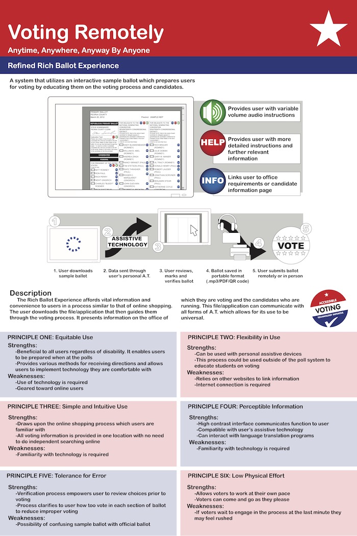 The Rich Ballot Experience affords vital information and  convenience to users in a process similar to that of online shopping. The user downloads the file/application that then guides them through the voting process. It presents information on the office of which they are voting and the candidates who are running. This file/application can communicate with all forms of AT which allows for its use to be universal.